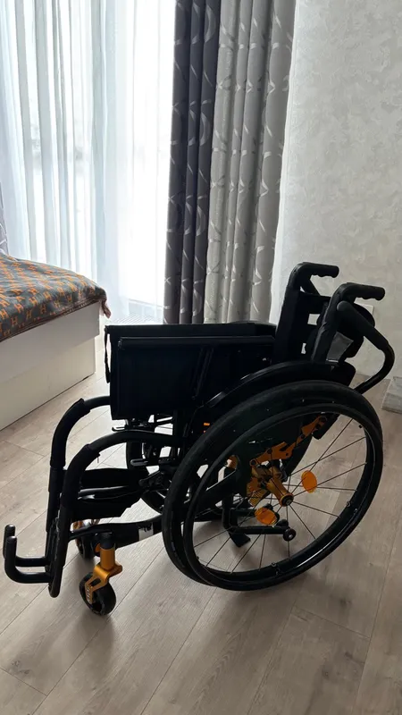 Качественная удобная коляска, супругу(рост 180) удобно вставать и садиться т.к она можно сказать высокая, для квартиры с узкими проёмами(самый узкий 58см) то что нужно, хотя ему приходится в узком коридоре потрудиться чтобы проехать в ванную, конечно у кого рост низкий то сложновато будет на ней тянуться к колёсам, на улице также хорошо передвигаться с задними надувными колёсами на длительное расстояние но с сопровождающим, ему одному с длинными и сильными руками далеко не уехать, только на небольшие расстояния нормально передвигаться без помощника, из недостатков можно только сказать про немного болтающиеся подлокотники(как у всех этих колясках), в комплекте был нормальный и рабочий насос и один ключ, коляска быстро и удобно складывается и также быстро раскладывается, что очень удобно и довольно часто это делаем в квартире, в целом хорошая коляска и он абсолютно доволен этой(46см сиденье) моделью. ДОПОЛНЕНИЕ: Коляске уже почти год через месяц будет и всё с ней отлично и нет никаких проблем, эксплуатация практически всегда в квартире, раза три четыре ездили на ней в поликлинику (с километр примерно туда обратно), ничего не сломалось и не отвалилось за это время эксплуатации, единственное примерно раз в месяц он всегда подкачивает колёса, насос также работает без проблем и нареканий, хорошая и удобная коляска и в квартире везде может на ней проехать, всем здравия и удачи.